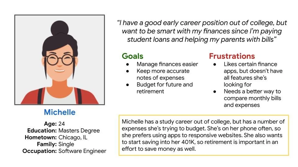 Michelle is a recent grad software engineer who needs to budget her expenses because she wants to keep track of her bills and finances.